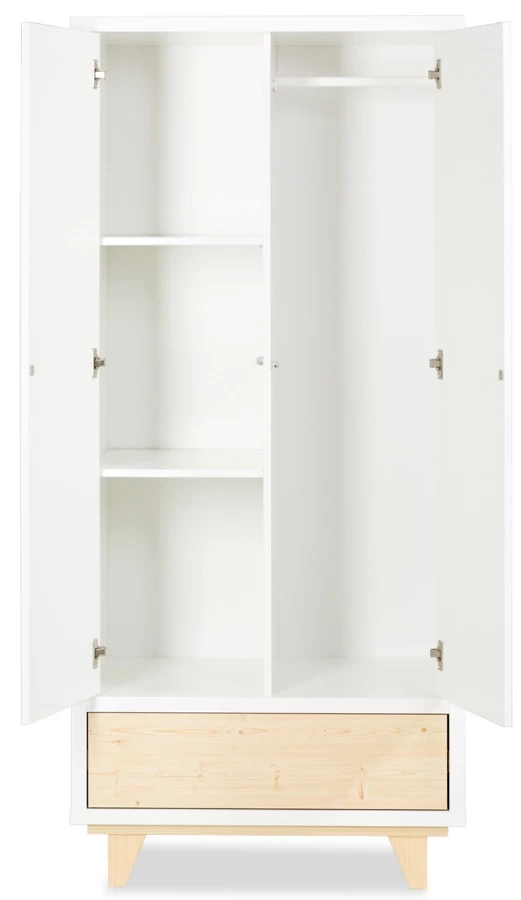 De kast heeft 2 deuren met een roede aan de ene kant en 2 planken (3 vakken) aan de andere kant. Ook heeft deze kast een grote lade waarin je bijvoorbeeld lakentjes en dekentjes kan opbergen. De deuren en de laden openen door het ‘Push to open’ systeem.