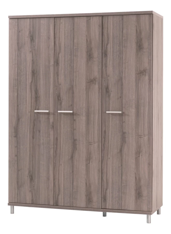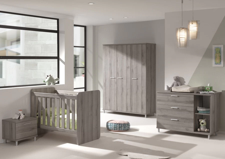 Deze kast heeft drie openslaande deuren van grijs houtlook met zilveren grepen. De binnenkant bestaat uit een groot hanggedeelte en een aantal planken. 3-Deurskast Naomi is goed te combineren met de andere meubels uit deze collectie: een meegroei ledikant, nachtkastje en commode. Ook verkrijgbaar als 3-delige set.