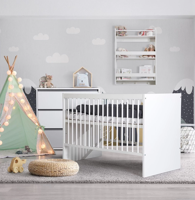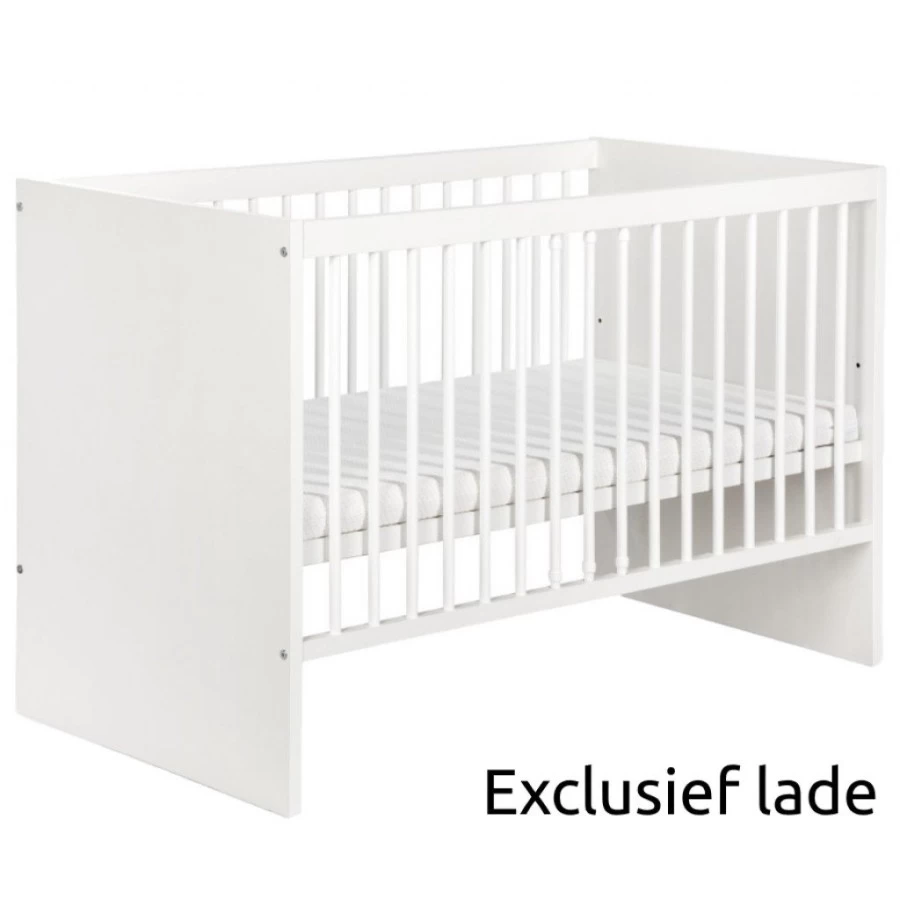 De babykamer Jasmijn is een stijlvolle en betaalbare babykamer met een prachtig wit/grijs design, bestaande uit een ledikant en commode.