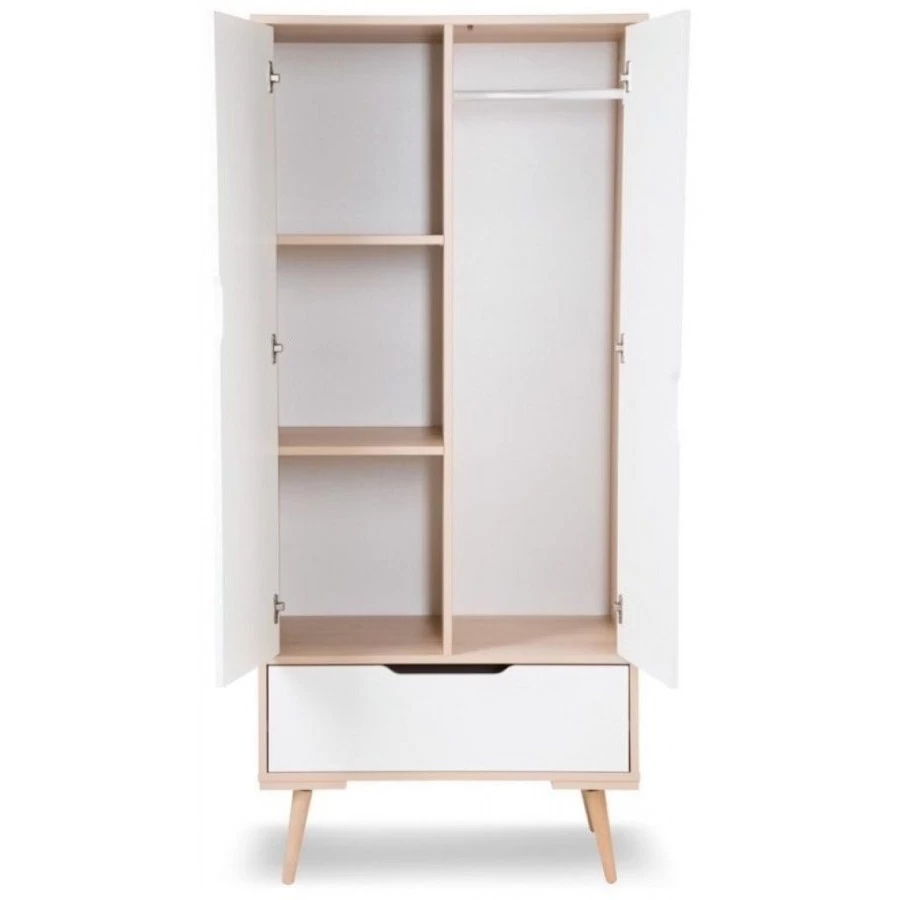 De kast Marloes biedt lekker veel opbergruimte voor jou en je kleine. Achter één van de deuren bevindt zich een roede met de mogelijkheid om kleertjes op te hangen. Achter de andere deur bevinden zich 2 legplanken die 3 handige vakken vormen. Verder heeft de kast aan de onderkant nog een praktische lade die gedragen wordt door extra stevige ladegeleiders. De kast Marloes is gemaakt van hoogwaardig, stevig beukenhout i.c.m. plaatmateriaal en is afgewerkt in een naturel houtkleur gecombineerd met strak wit.