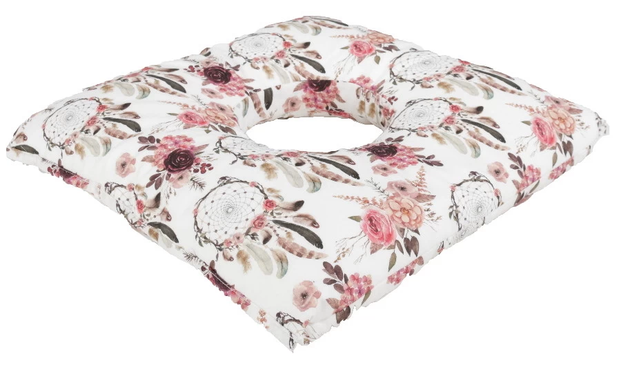 De vulling bestaat uit hypoallergene microparels, waardoor het kussen geclassificeerd wordt als een medisch hulpmiddel. Microparels vormen zich bijzonder goed naar het lichaam waardoor het kussen zeer comfortabel is. De hoes is gemaakt van 100% katoen en voelt zacht aan. Hij heeft een mooie print met dromenvangers en bloemen. Hij is 50 x 45 cm groot en heeft een ronde uitsparing.