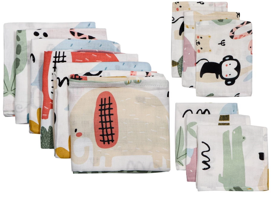 De monddoekjes zijn 30 x 30 cm groot, de washandjes zijn 15 x 21 cm en de luiers zijn 70 x 70 cm. Deze set is gemaakt van 100% hydrofiel katoen. Ideaal voor thuis én onderweg! Wasbaar op 60ºC.