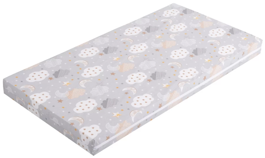 Dit matras is 60 x 120 cm groot en daarmee geschikt voor in een ledikant. Het matras heeft een leuke print met wolkjes en sterren.
