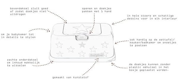 De FunkyBox sluit perfect af om te voorkomen dat de billendoekjes uitdrogen en de speciale opening zorgt ervoor dat het volgende doekje altijd te voorschijn komt. Met 1 hand zijn de doekjes er makkelijk uit te halen zodat je andere hand vrij is om je kleintje op zijn/haar plaats te houden. Dankzij de extra brede maat is de box geschikt voor bijna alle soorten vochtige babydoekjes. De afmetingen zijn 11 x 8 x 20,5 cm.