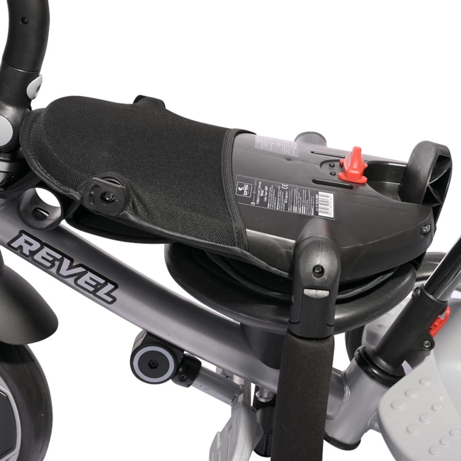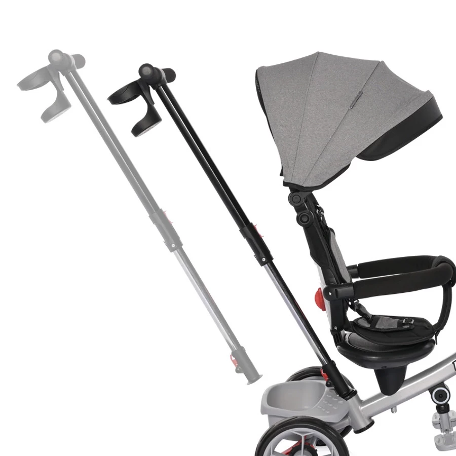 Aan de achterkant van de driewieler kun je makkelijk een duwstang (90-95cm) bevestigen waar je je kindje op de driewieler mee rond kunt duwen. Dit is erg leuk wanneer je graag wandelingen maakt en je kindje snel moe is of wanneer je kindje nog niet goed (zelfstandig) kan fietsen. De duwstok heeft twee standen en aan het handvat zit zelfs een bekerhouder! Wanneer je je kleine duwt met de duwstok, kan je kindje makkelijk zijn/haar voeten veilig op de voetensteun zetten, deze zit aan de onderkant van de driewieler en kun je in- en uitklappen. De stoel is 360º te draaien zodat je kindje met zijn/haar gezicht ook richting jou kan kijken.