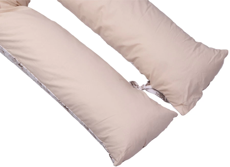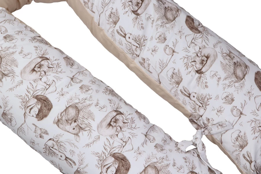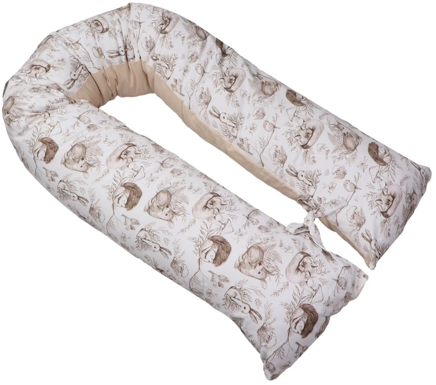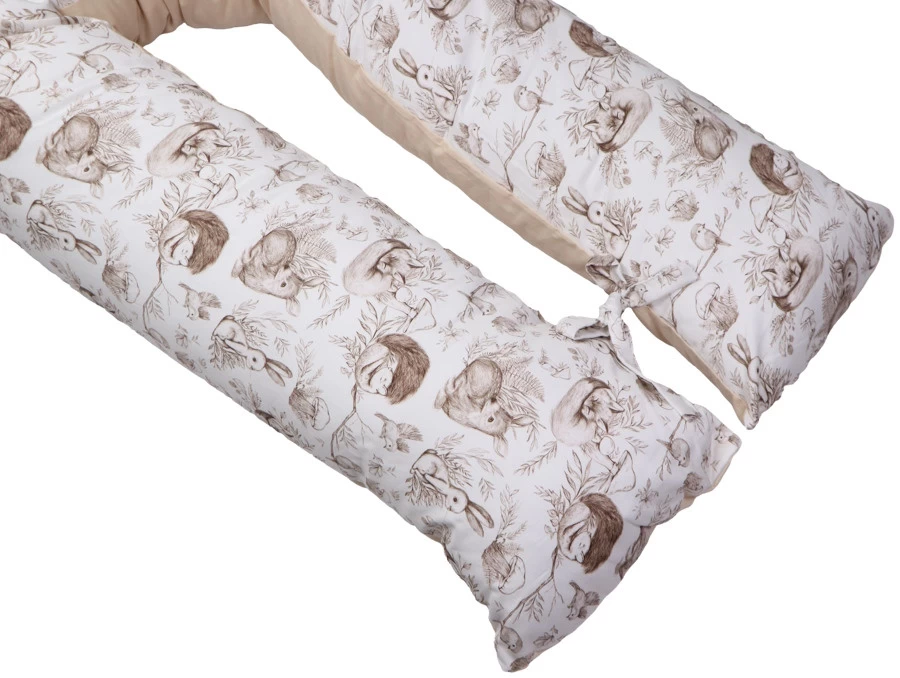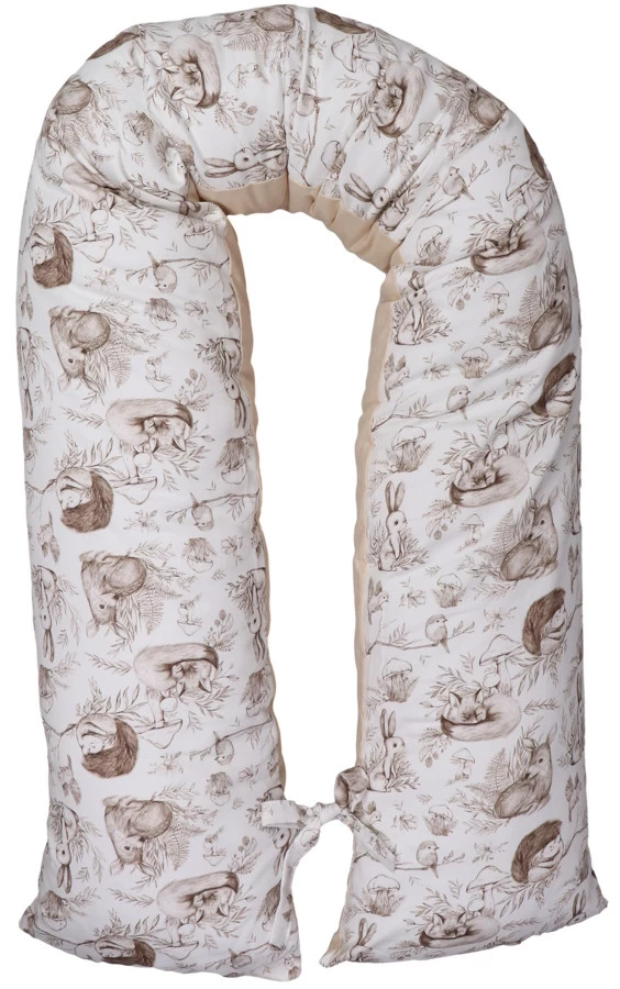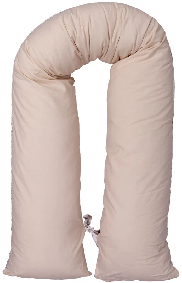 Het voedingskussen heeft een mooie print en een uni-kleurige kant: hierdoor kun je zelf kiezen welke kant je boven legt. Daarbij is hij voorzien van een afritsbare hoes die met de hand gewassen kan worden. Om de ronden vorm te behouden als je kleintje er op zit of tijdens het voeden, zitten er 2 touwtjes aan het einde van het voedingskussen die aan elkaar geknoopt kunnen worden. De lengte van het voedingskussen is 155 cm.