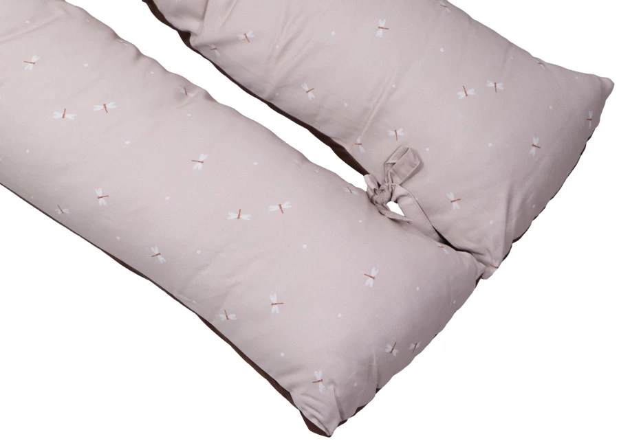 Het voedingskussen heeft een mooie print en een uni-kleurige kant: hierdoor kun je zelf kiezen welke kant je boven legt. Daarbij is hij voorzien van een afritsbare hoes die met de hand gewassen kan worden. Om de ronden vorm te behouden als je kleintje er op zit of tijdens het voeden, zitten er 2 touwtjes aan het einde van het voedingskussen die aan elkaar geknoopt kunnen worden. De lengte van het voedingskussen is 155 cm.