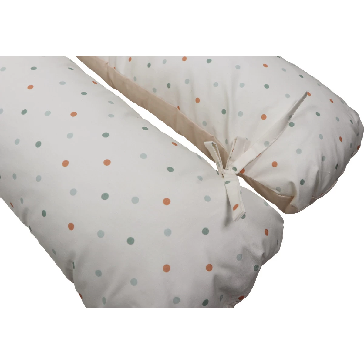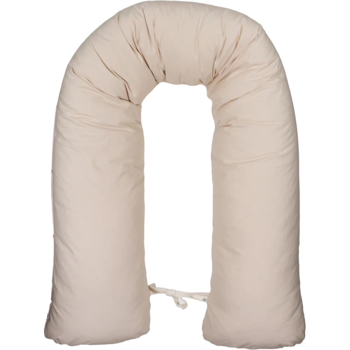 Het voedingskussen heeft een mooie print en een uni-kleurige kant: hierdoor kun je zelf kiezen welke kant je boven legt. Daarbij is hij voorzien van een afritsbare hoes die met de hand gewassen kan worden. Om de ronden vorm te behouden als je kleintje er op zit of tijdens het voeden, zitten er 2 touwtjes aan het einde van het voedingskussen die aan elkaar geknoopt kunnen worden. De lengte van het voedingskussen is 155 cm.