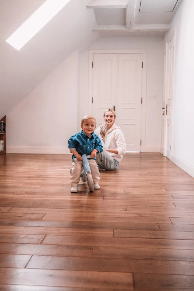 De loopfiets heeft zachte wielen die je vloer niet beschadigen, dit maakt hem geschikt om zowel binnen als buiten te gebruiken! Het fietsje heeft twee achterwielen en anti-slip handvaten wat hem veiliger maakt. Hij is geschikt voor kindjes vanaf 12 maanden (max. draaggewicht 25 kg) en is met zijn zachte kleuren ook nog eens stijlvol!